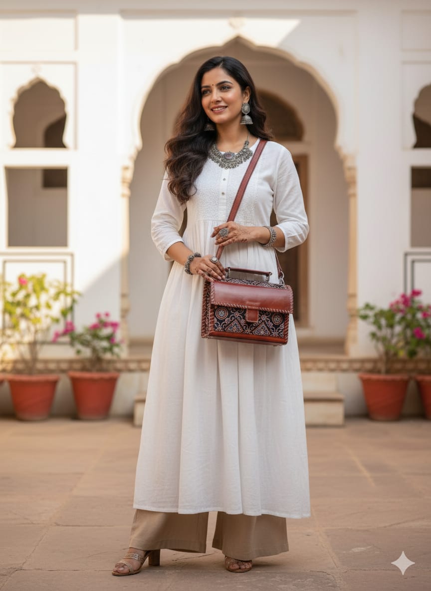 Discover the perfect blend of tradition and modern style with our Ajrakh and Leather Sling Bag. Handcrafted with intricate Ajrakh block prints using mashru silk, this bag showcases the rich heritage of Indian craftsmanship. The durable leather trim adds a touch of elegance and functionality, making it ideal for everyday use.
